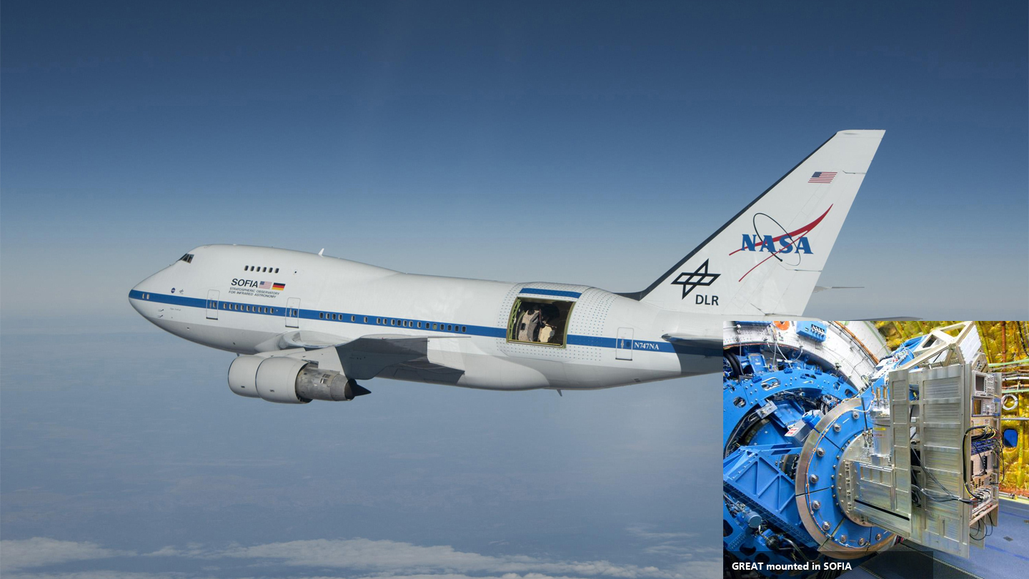 Stratospheric Observatory For Infrared Astronomy (SOFIA). Inset: GREAT heterodyne receiver. [OS]