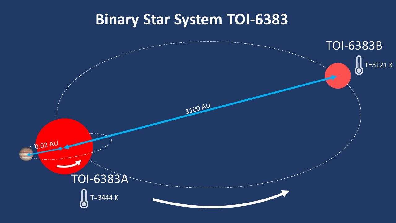A giant star orbits one of the stars in the binary star system TOI-6383. As both stars are dwarf stars, a problem due to the mass budget comes up.