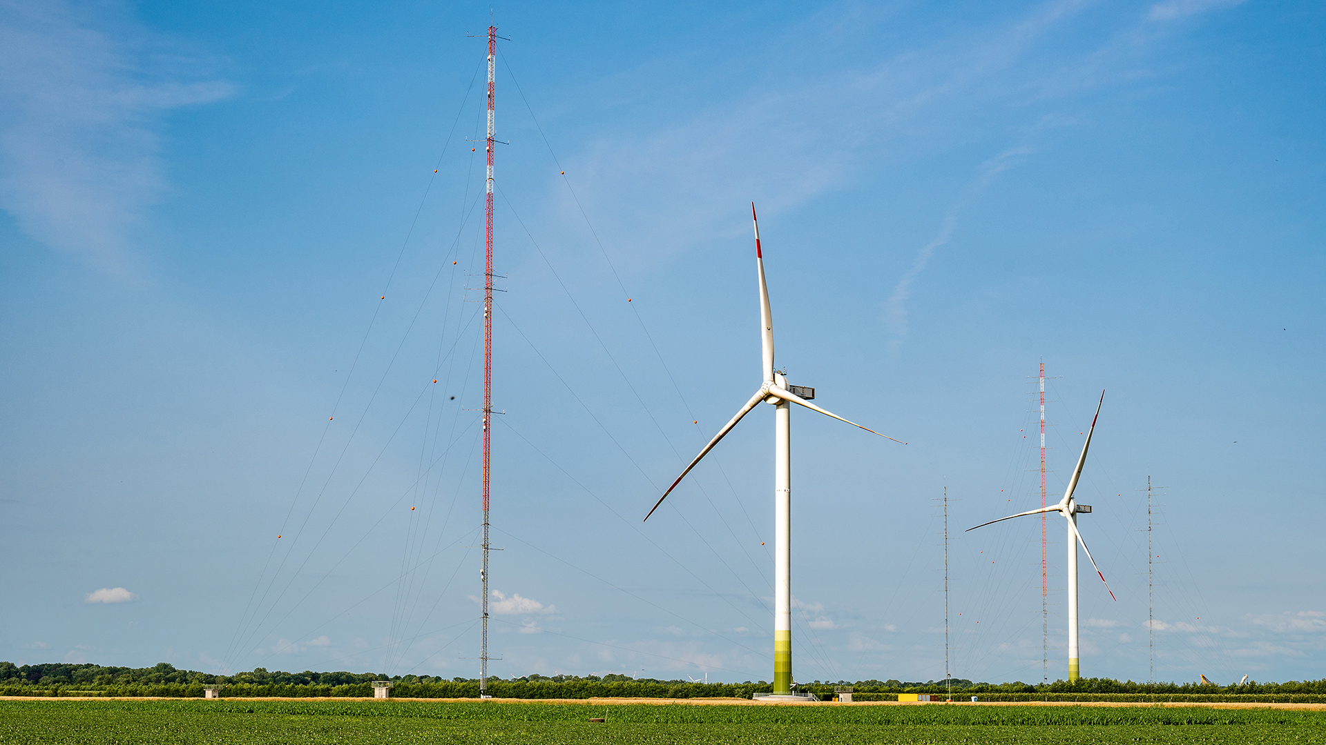 At the DLR Research Wind Farm WiValdi, the IECplus measurement mast, wind turbine OPUS 1, the mast array, and wind turbine OPUS 2 are arranged in the main wind direction, one behind the other, to better study the wake flow of the two wind turbines.