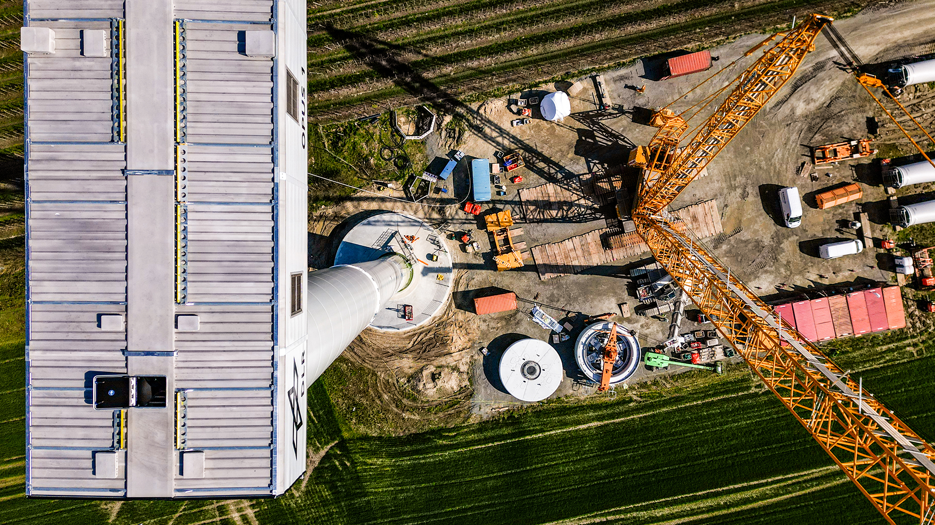 Construction work at the DLR Research Wind Farm WiValdi. Installation of the OPUS 1, one of the two Enercon E115 4.26 MW wind turbines for research purposes at the wind farm. Crane operations for assembling the components.