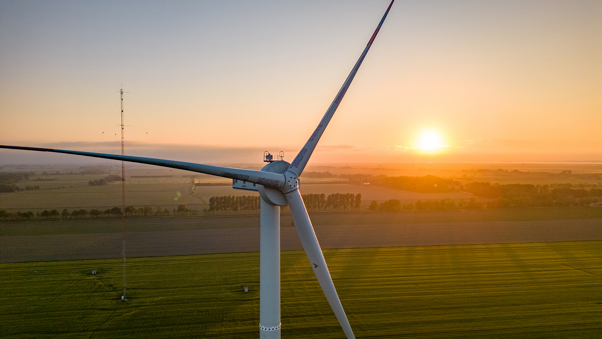 Wind turbine OPUS 1 and IECplus measurement mast at the DLR Research Wind Farm WiValdi in the evening sun.
