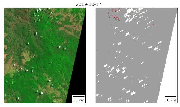 The fires have also been monitored by Sentinel-2 and Landsat-8 satellites, which carry multi-spectral sensors that acquire images in the visible spectrum, near and short wave infrared at spatial resolutions of 10 to 30 m. The high temporal revisit period of Sentinel-2 and the combination with Landsat-8 allowed monitoring the evolution of the fires at short time intervals and across large geographical areas. Burnt areas have been mapped automatically from the images using a pre-trained convolutional neural network.