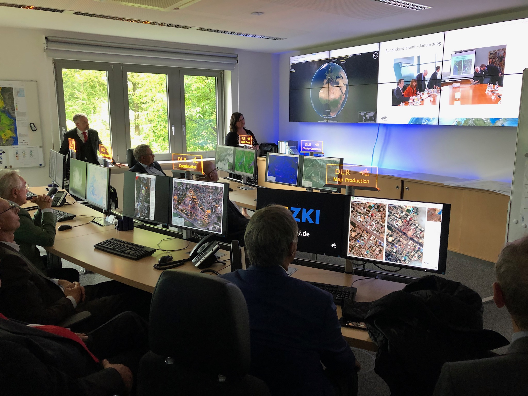 The guests were given an insight into civil security research at DLR. Among other topics, the focus was on presentations of DLR's contributions to reconnaissance and situational awareness in the context of missions by different security forces, as well as work on drone defence. In addition to the Institute for Air Transport and Airport Research, the Commission also visited the Earth Observation Center (EOC) and the Center for Satellite Based Crisis Information (ZKI). At ZKI Earth Observation data such as satellite or aerial imagery as well as geo data are acquired and analysed in order to generate up-to-date situational awareness information before, during or after a disaster situation or in case of major events. Main national and international user groups are political decision makers, situation centers and relief organisations.