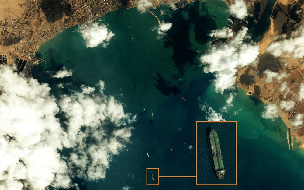 In the satellite image chips from 25.03.2021 and 26.03.2021, the damaged ship and waiting ships can be recognize in the Red Sea.