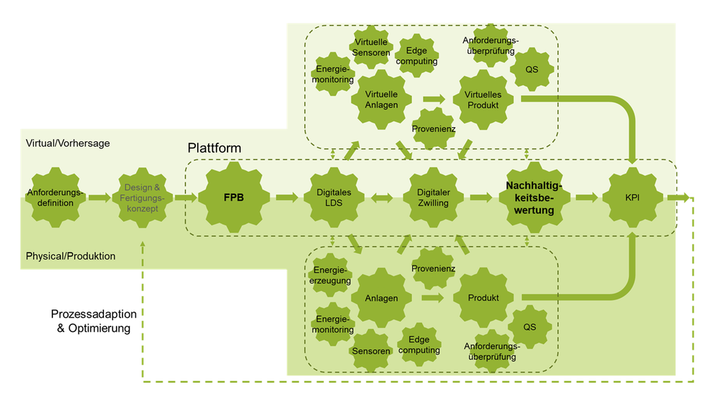 As part of the sub-project, key aspects of the necessary capabilities will be developed, provided and connected in the IoT context. The sub-project requires the expansion of a modelling capability for the manufacturing process based on a formalised description. To define this, the sub-project will take into account the information requirements for sustainability forecasting using LCA software. The capabilities for process modelling and processing the data obtained for eco-efficiency assessment form the core of the platform developed in the overall project, see Figure 1. In the sub-project, the improved formalised process description will be established as a universal input for process modelling, its implementation in the digital Life Data Sheet (LDS), the structure of the digital twin and the sustainability assessment derived from it on the basis of virtual and real process data.